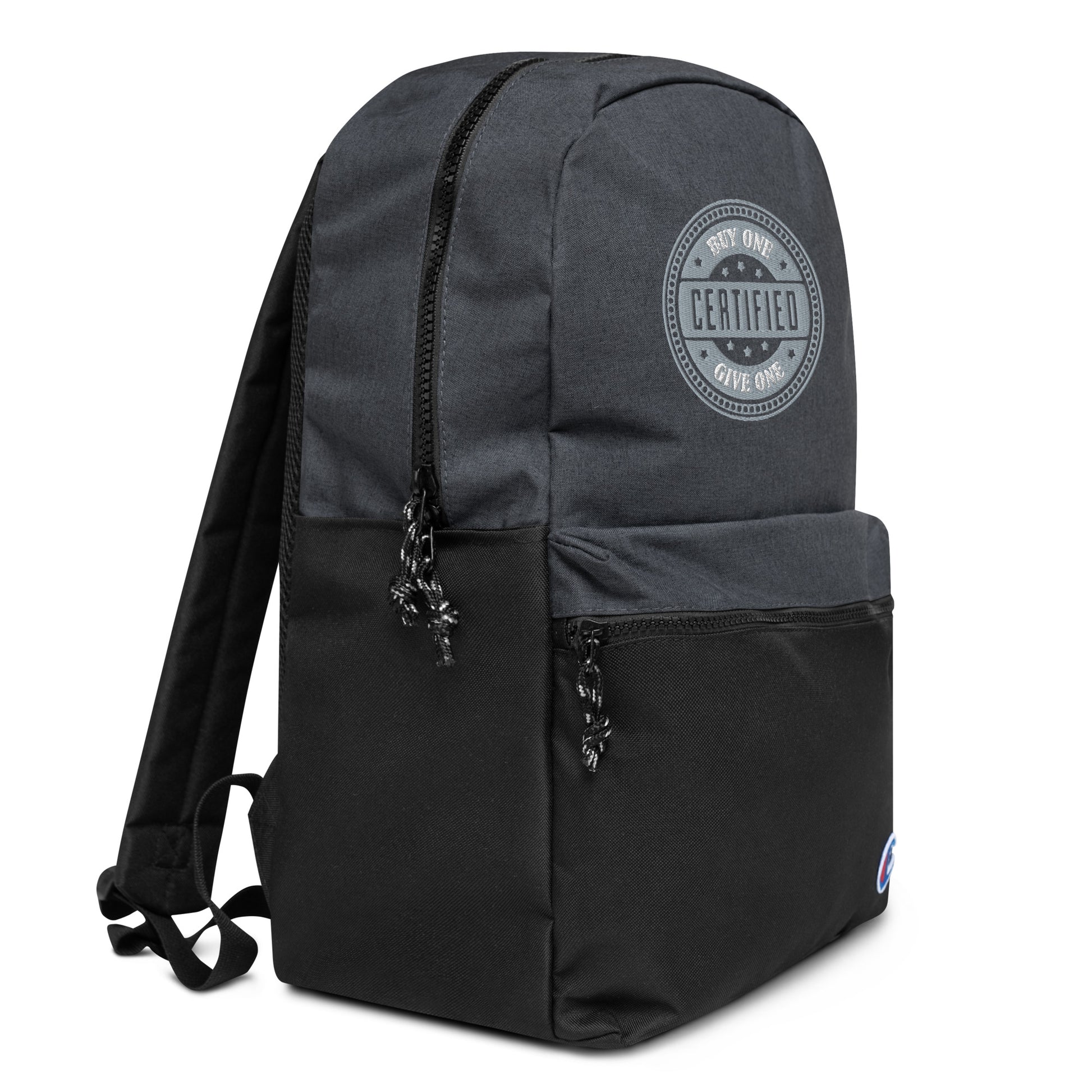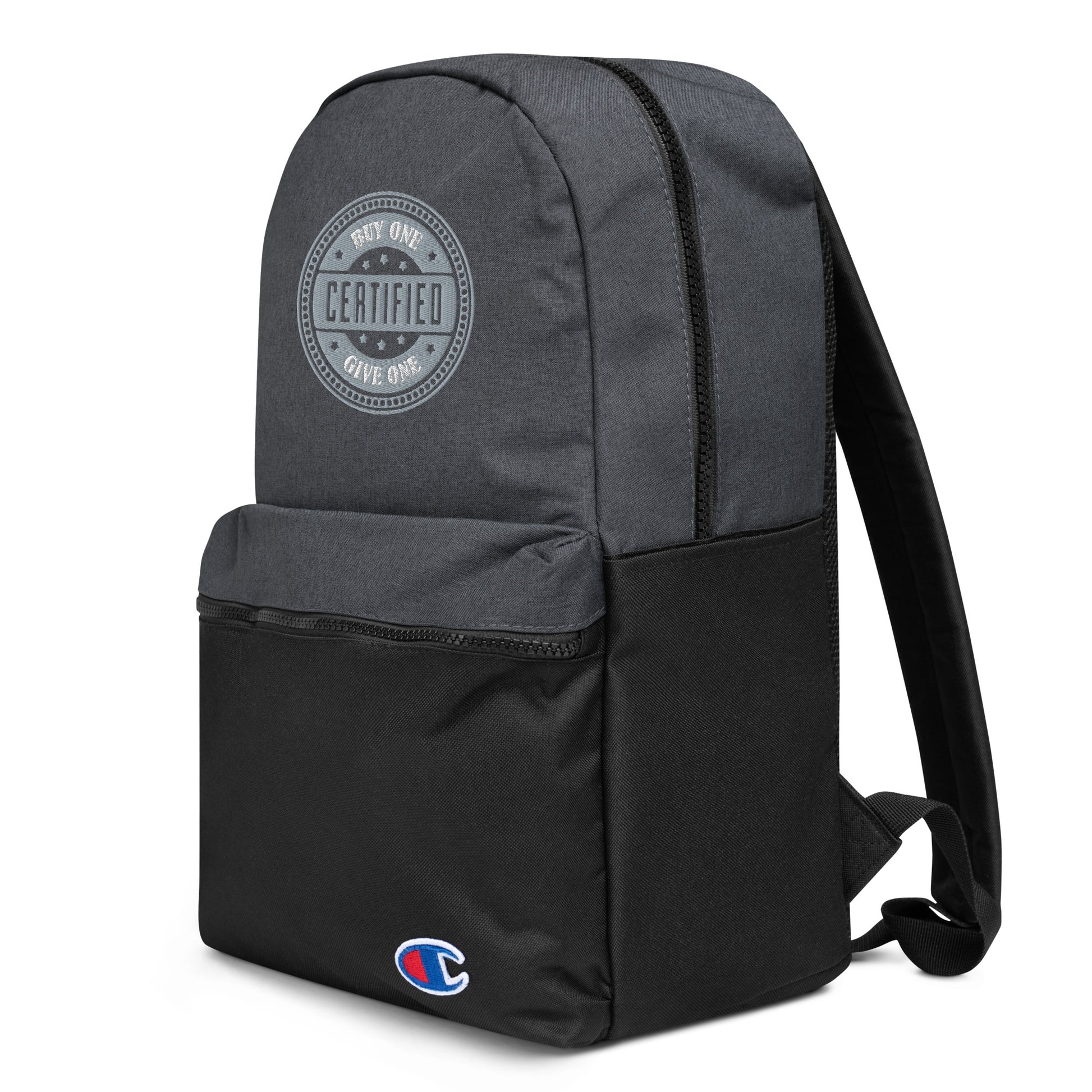 • Padded ergonomic polyester bag straps with plastic strap regulators and Champion brand label on the left strap